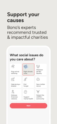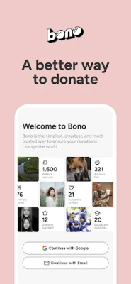 Whether you want to stop animal suffering, end hunger, enable mental health, fight the climate crisis, empower gender equality, or support other important causes, Bono makes it easy to contribute and see your impact.